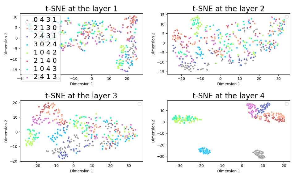 By layer 4, the aggregation of nodes (different colors = different node IDs) becomes clearly visible.